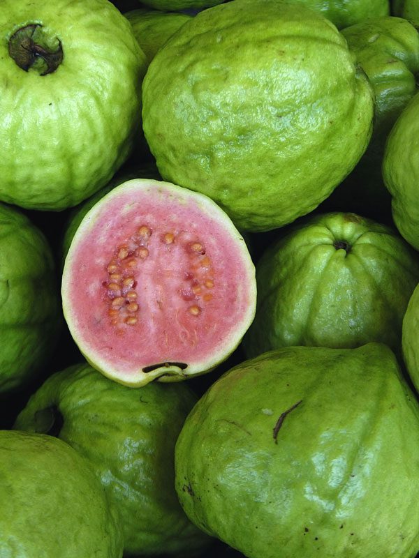 Barbie Pink Guavas grow at various times of year. Barbie Pink Guavas are mature and ready to eat when they are yellow-green, juicy, sweet, and about 1 pound.