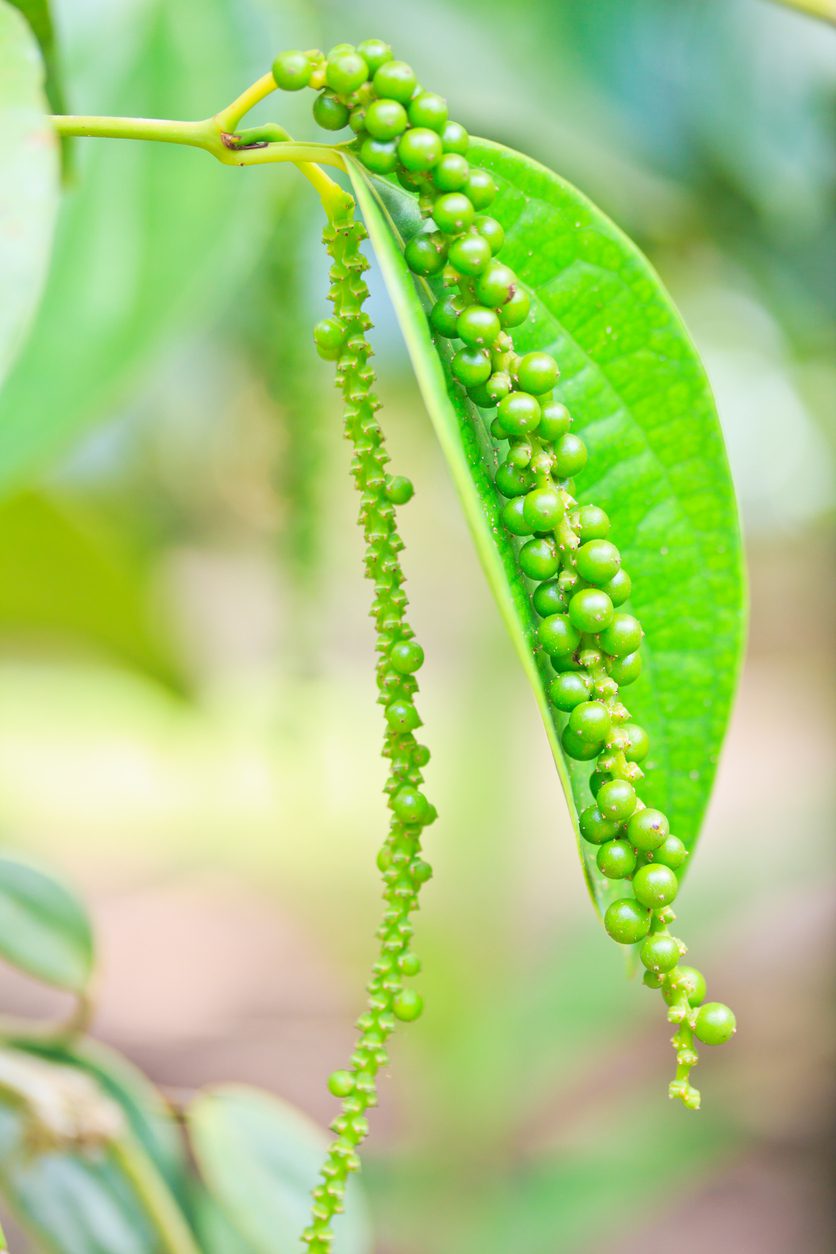 Black Pepper Plants grow flowers at the leaf nodes and the plants can bloom throughout the year. After the flowers fall, tiny green Peppercorns form on the long bloom stems. The Peppercorns mature in size and will ripen to a bright red. Red and Green Peppercorns often appear on the same Peppercorn Chain and the berries can be picked at any time once the first red berries arrive on a given Peppercorn spike.