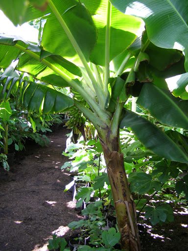 Bananas are tropical herbacious plants that grow multiple pseudostems from a pseudoblub. Each cluster of banana pseudostems is called a mat. The oldest pseudostems (commonly called banana trees) produce fruit, while the younger trees are grown to replace the fruited stalks. Once a single pseudostem blooms and grows fruit, that trunk is removed and the next lagest tree replaces it.