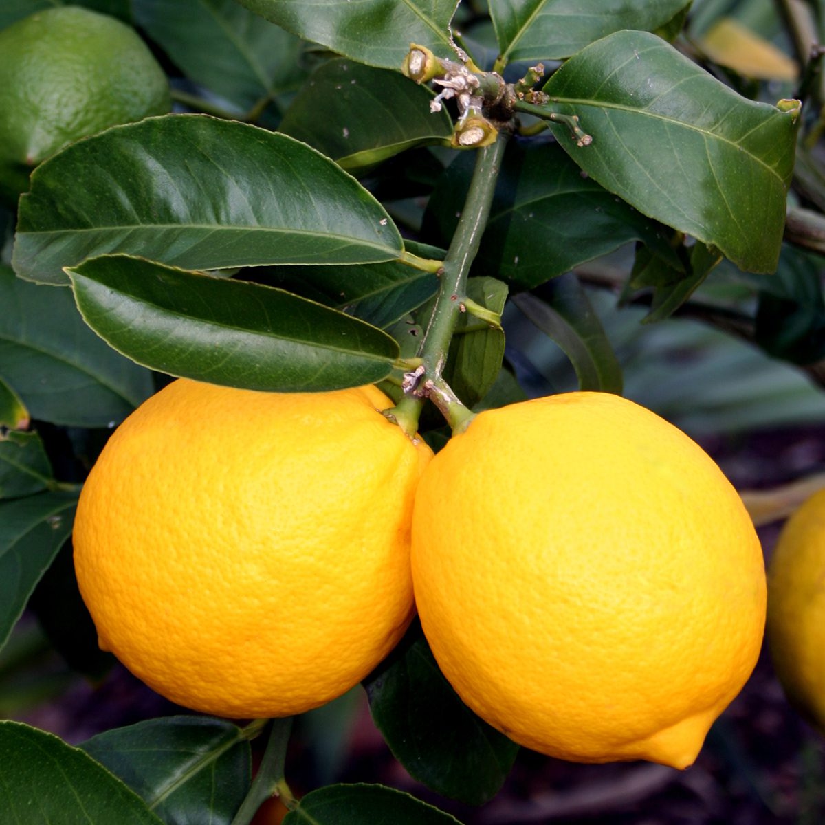 The Meyer Improved Lemon Tree is a hybrid between a common lemon tree and a mandarin orange tree. This lemon tree variety has a spreading habit and is nearly thornless. The fragrant blooms of this lemon tree then turn to medium-sized, orange-yellow, juicy sweet-tart lemons that are in season in fall/spring.