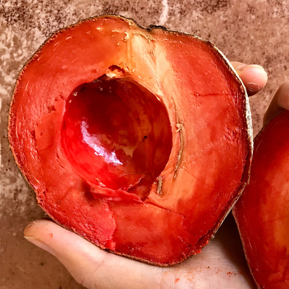 The Pace Mamey Sapote Tree is a rare Mamey Sapote Cultivar, and many say one of the most delicious. The Pace Mamey Fruit Tree is the result of crossing a Magana Mamey with a Tazumal Mamey. The result is a smaller (6 to 8 inch) fruit with orange-red flesh, sweet taste, and a slightly more cold-tolerant tree. Pace Mamey Sapotes ripen in the spring after the previous spring’s bloom. They can be grown in the ground in USDA Zones 9 to 11, and in pots in Zones 4 to 11. They are cold hardy down to 32ºF (as opposed to about 40ºF for other Mamey Sapote Varieties.)