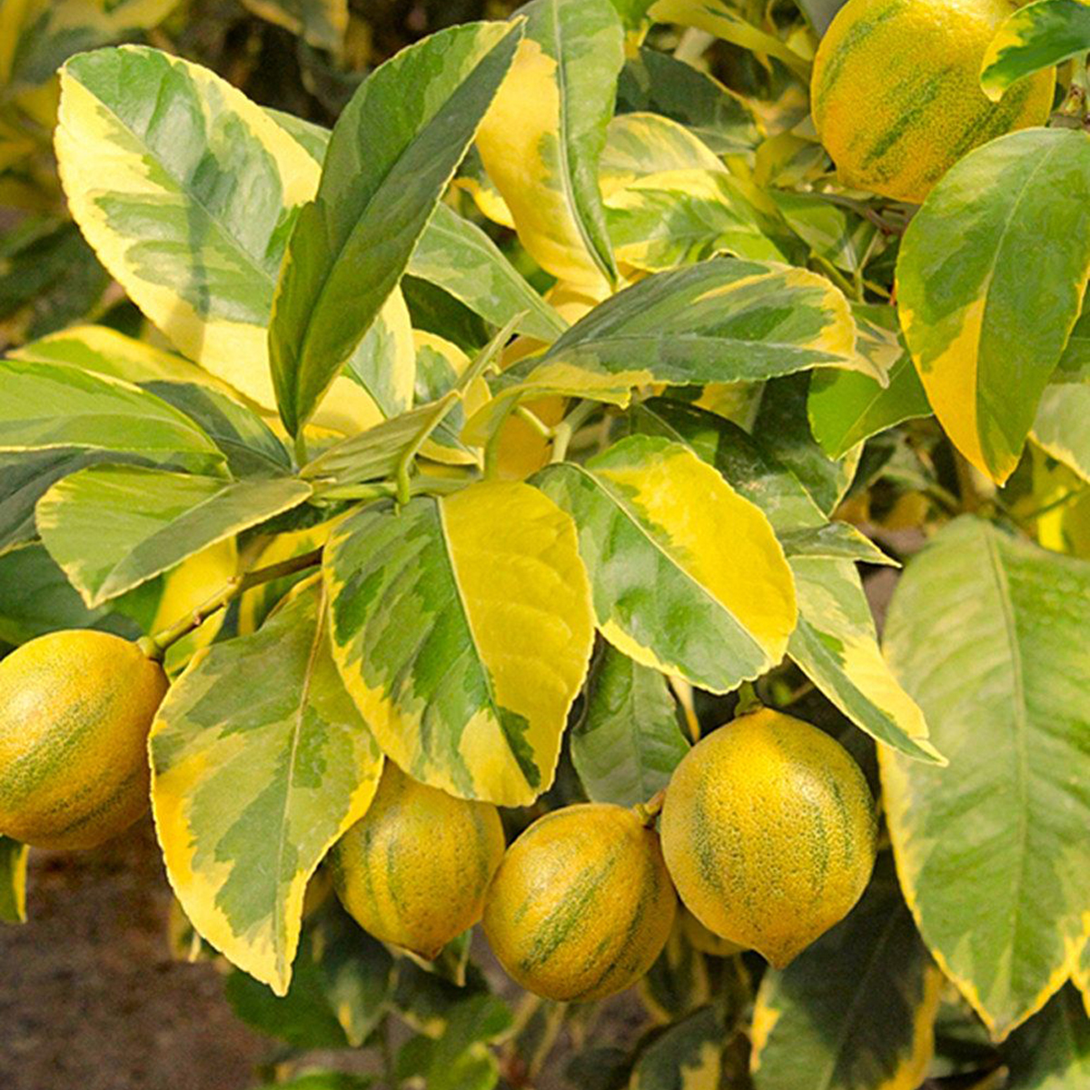 Pink Variegated lemon trees make fine ornamental trees because of their glossy, evergreen, green and cream-colored foliage and fragrant white blooms that are in season in spring or fall. They bear low-seeded pink-fleshed lemon fruits that have green-stripped rind while still immature. As the fruits ripen, they lose their stripes and the rinds turn yellow with pink oil glands.