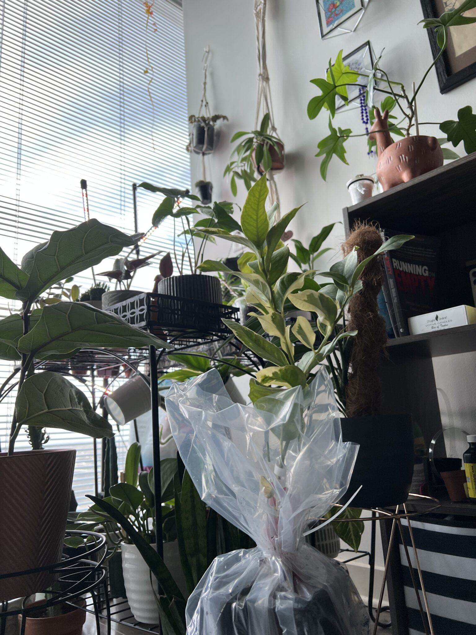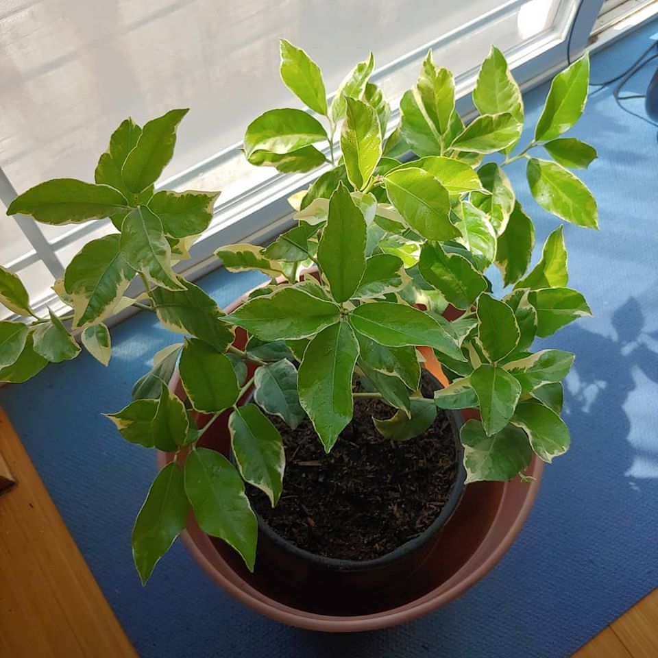 college-age daughter. It arrived well-packed with easy transplant and care instructions. It now resides in a large pot on my sunny deck in northern Virginia and will winter indoors in an equally sunny spot. It has taken it’s transplanting well, and even shows new leaf growth at the top! Someday we hope it will move with my daughter to her permanent post-college home. In the meantime, we will enjoy it’s pretty variegated leaves😁