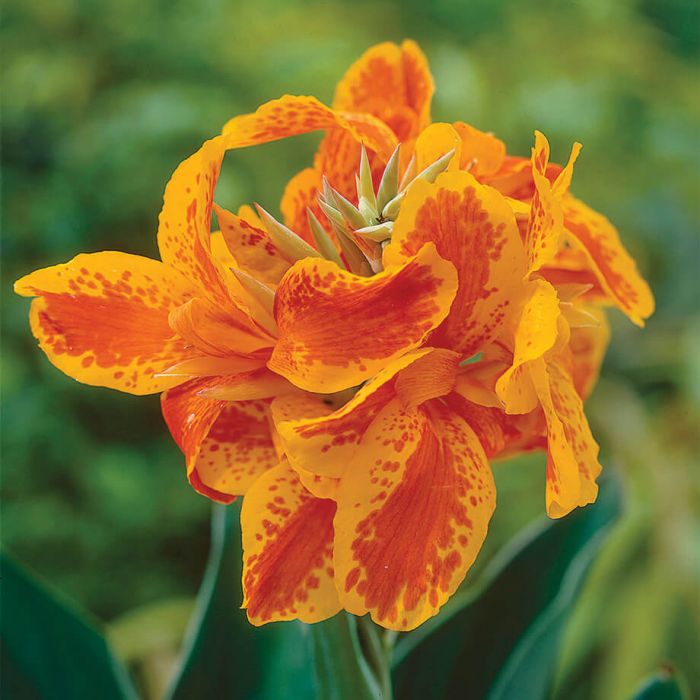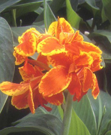 Taroudant Canna Lily Plants are herbaceous plants that grow pointed oval leaves on tall canes that produce gorgeous flower clusters of wide, curled blooms in bright orange with darker orange spots. Taroudant Canna Lily Plants grow to about four feet tall and their bases spread from rhizome sports which can fill a six foot diameter bed in a season. Taroudant Cannas begin to bloom in late spring or early summer and continue to produce flowers until the first frost of winter.