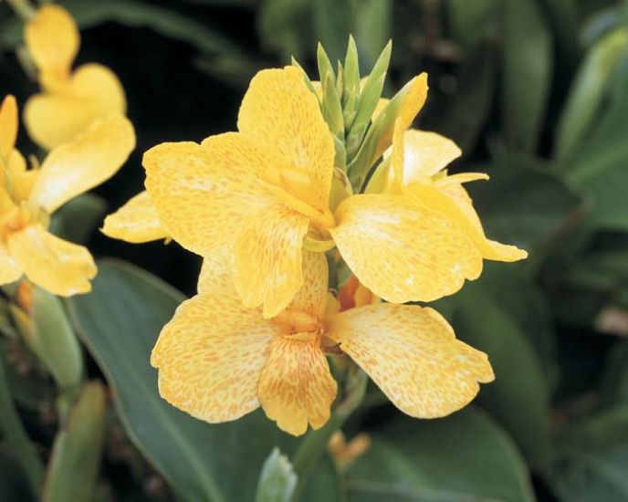 Tropical Yellow Canna Lily Plants are related to banana plants and are most often grown for their spring and summer flowers. Tropical Yellow Canna Lily Plants have wide, pointed leaves and glowing yellow flowers that grow in clusters on the tops of their long stems. Also called Arrowroot or Canna Lily, Cannas grow from seeds or rhizomes. The plants also send forth new shoots that cause the plants to spread. They do best in the ground in USDA Zones 7 to 12, or in pots in Zones 4 to 12.